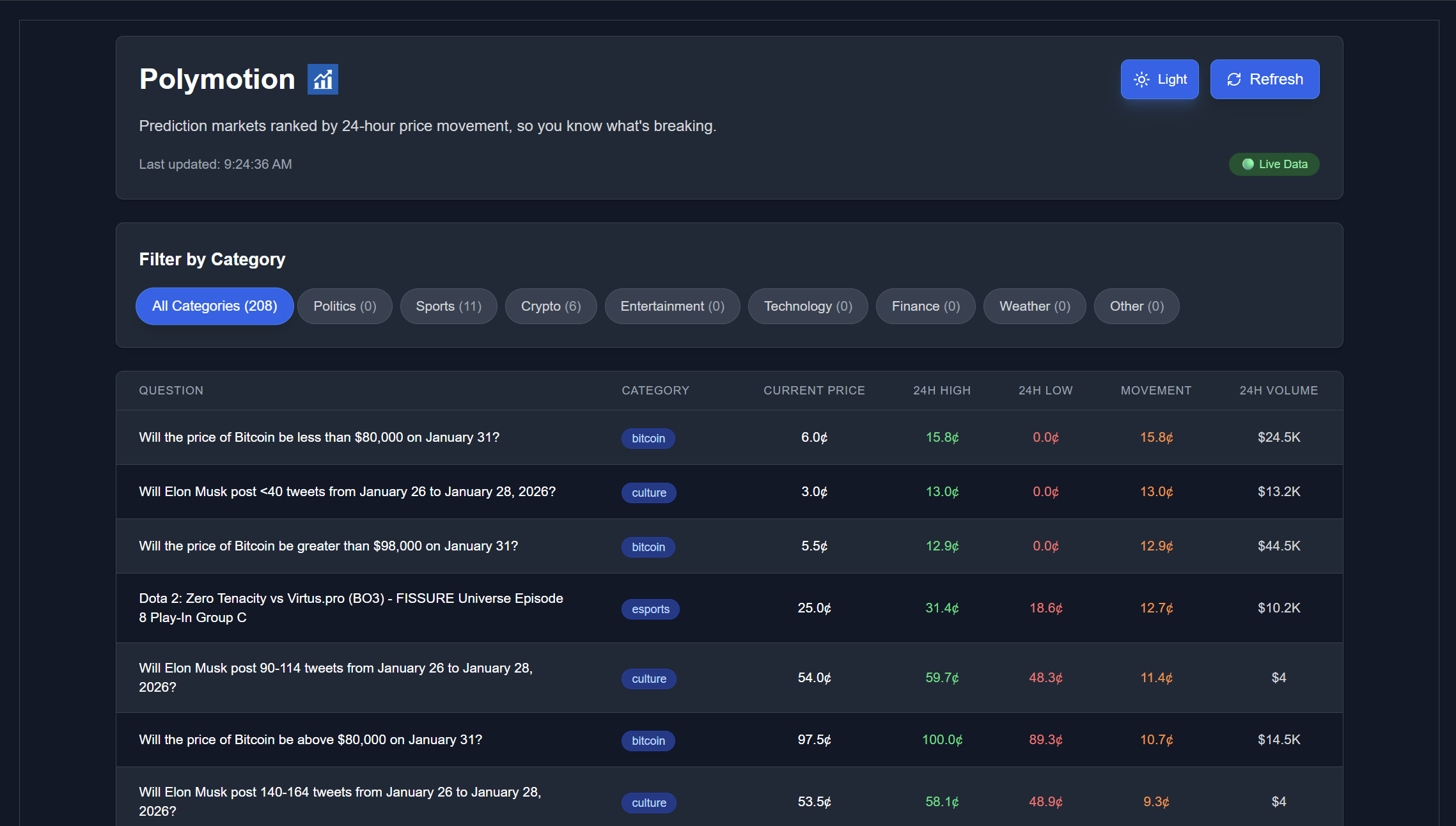 A web app that displays the top Polymarkets with the largest price movements over the last 24 hours, so you can see what news is breaking. Built with Polymarket Gemini API for a very demanding CEO. Website